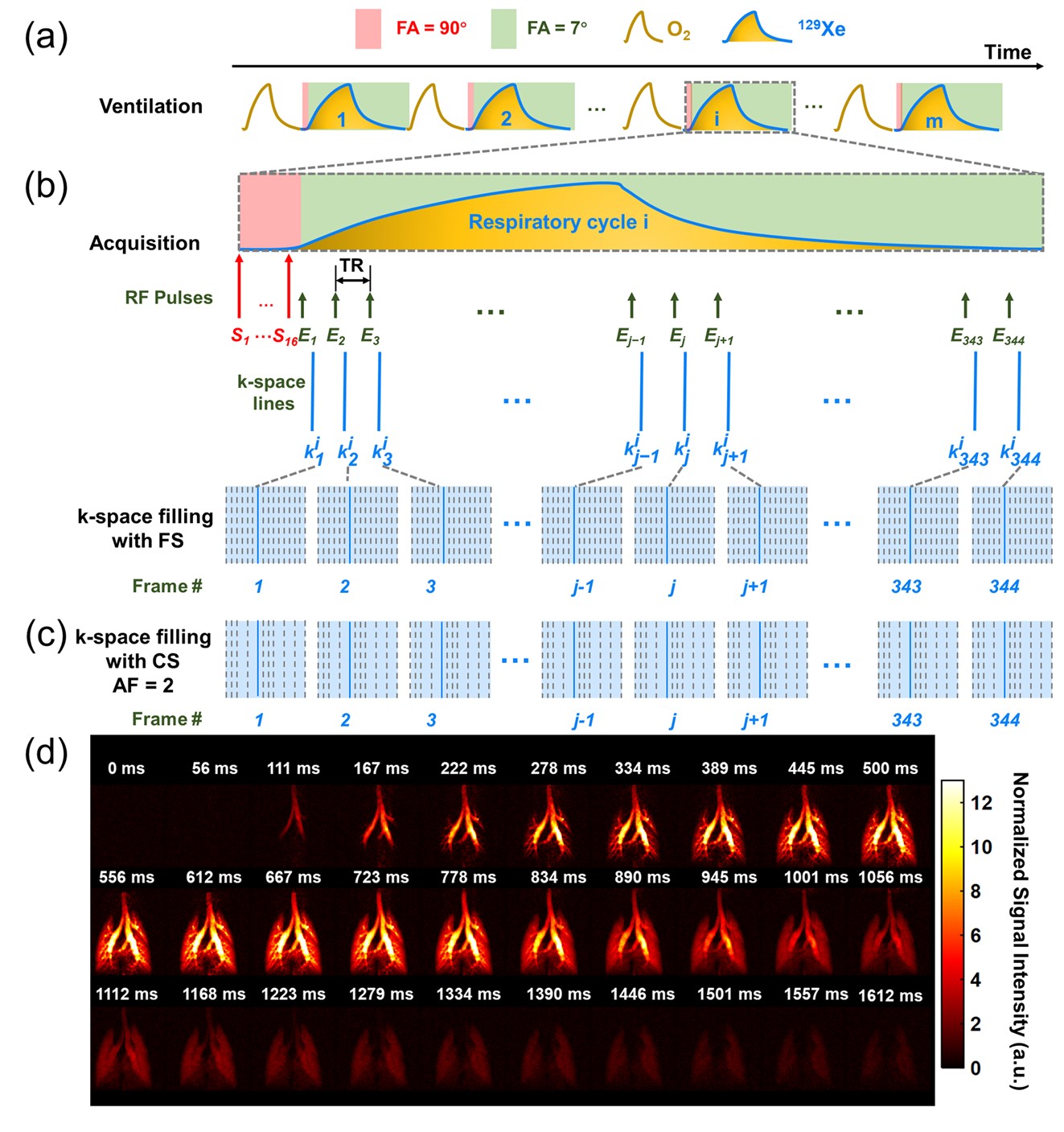 针对上述难题,研究团队开发了一种高时空分辨率动态通气功能成像新方法(图1a-c),获得了亚毫米空间分辨率(0.5 mm)和毫秒级时间分辨率(5.6 ms)的肺部动态通气成像,实现了肺部整个呼吸周期内的气体动力学可视化评估(图1d)。该方法的主要原理是利用多次呼吸和k空间线采样技术提高超极化129Xe动态通气成像的时空分辨率。传统动态成像的时间分辨率取决于相位编码步数N和重复时间TR,即N×TR。肺部呼吸是一种周期性运动,利用这种周期性,可以在每次呼吸过程中连续采集同一条相位编码的k空间线(称为k空间线采样技术),不同呼吸采集不同的相位编码,直至所有k空间数据采集完成。因此,该研究团队所提出的方法获得的图像时间分辨率为TR,比传统方法提高了N倍。