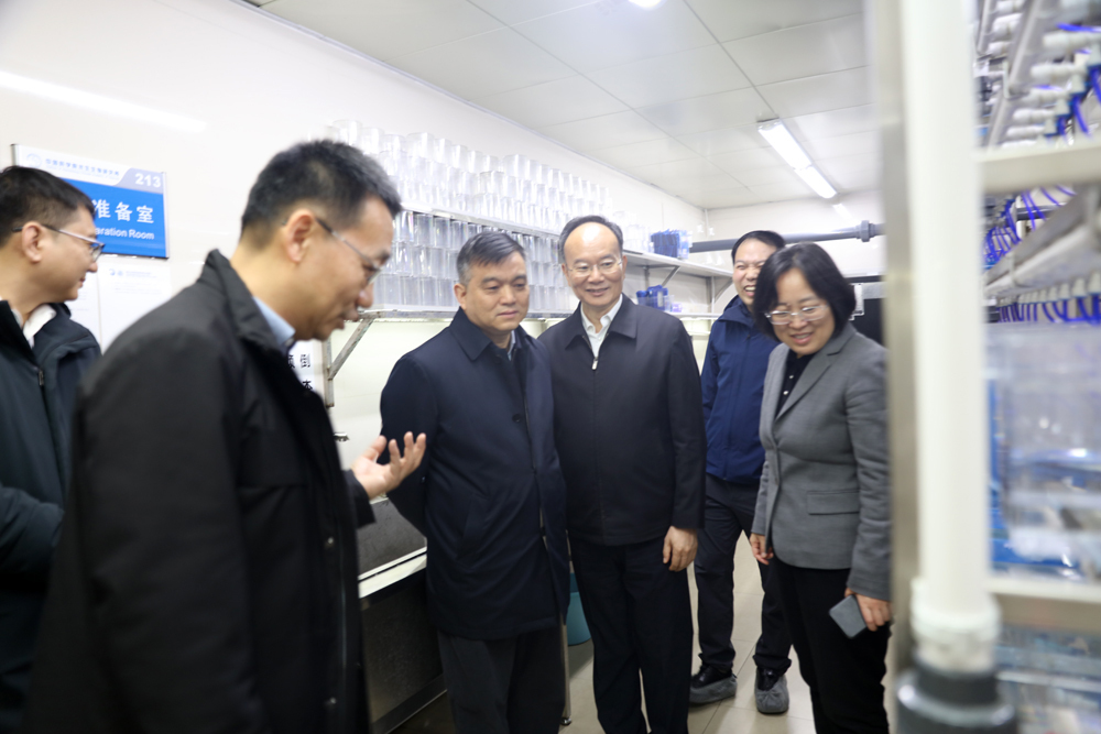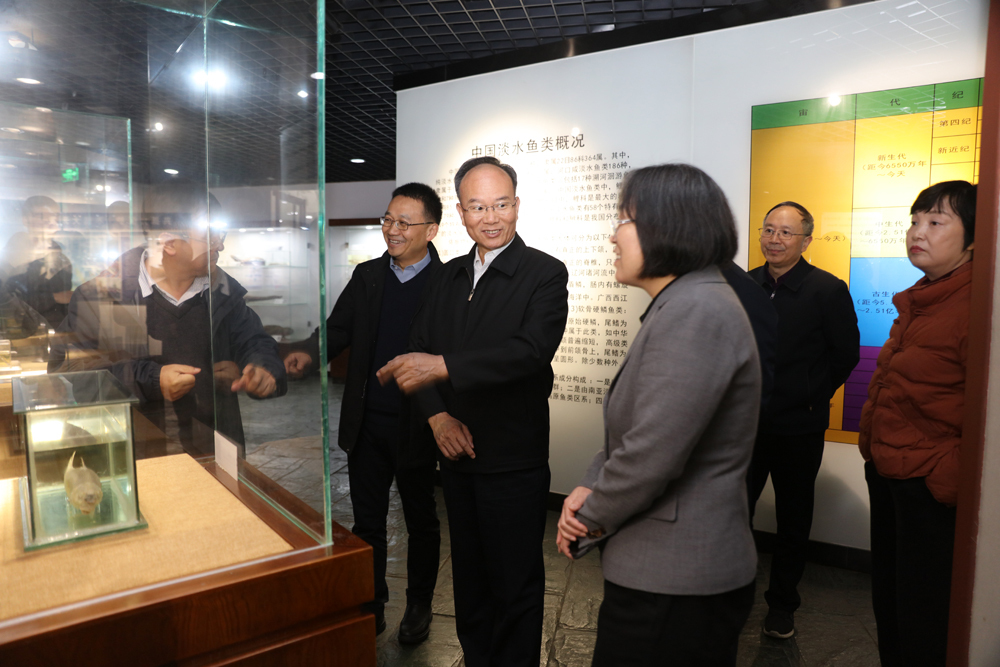 徐文海一行先后参观了水生生物博物馆、所史馆、国家水生生物种质资源库、长江江豚繁育中心、水生命大数据与人工智能中心等,详细了解水生所发展历程与学科布局、种质资源收集保存与创新利用、长江江豚人工繁育与野外保护、智慧监测与大数据支撑等情况。
