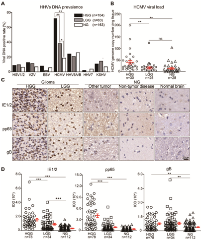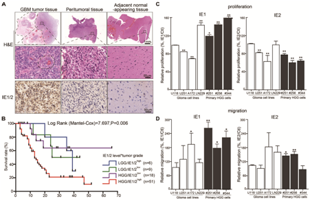 该研究在健康人群疱疹病毒感染率的基础上,以胶质瘤病人为研究对象(以其他脑肿瘤、非肿瘤其他脑疾病及正常外伤脑组织为对照组),首先对378例样本进行了9种人疱疹病毒基因组DNA的阳性率的横断面研究。与其他8种疱疹病毒相比,HCMV基因组DNA的阳性率相对较高,并与肿瘤级别相关;高级别胶质瘤中,HCMV基因组拷贝数和蛋白水平IE1/2、pp65和gB均显著高于对照组;IE1/2主要集中在肿瘤组织,但在瘤周和临近正常脑组织几乎不表达;IE1/2的水平与胶质瘤病人的生存期负相关。在胶质瘤细胞系和原代胶质瘤细胞分别过表达IE1和IE2,发现IE1和IE2均能促进胶质瘤细胞的迁移,只有IE1能促进胶质瘤细胞的增殖能力。