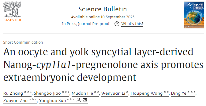 9月10日,中国科学院水生生物研究所孙永华团队在Science Bulletin(IF=21.1)发表题为An oocyte and yolk syncytial layer-derived Nanog-cyp11a1-pregnenolone axis promotes extraembryonic development的研究论文,揭示了一个存在于卵子发生和早期胚胎胚外组织中的“Nanog–cyp11a1–孕烯醇酮(Pregnenolone,P5)轴”,这一调控轴完美解释了Nanog促进早期胚胎胚外组织发育,以及协调胚胎组织和胚外组织发育的作用机制。