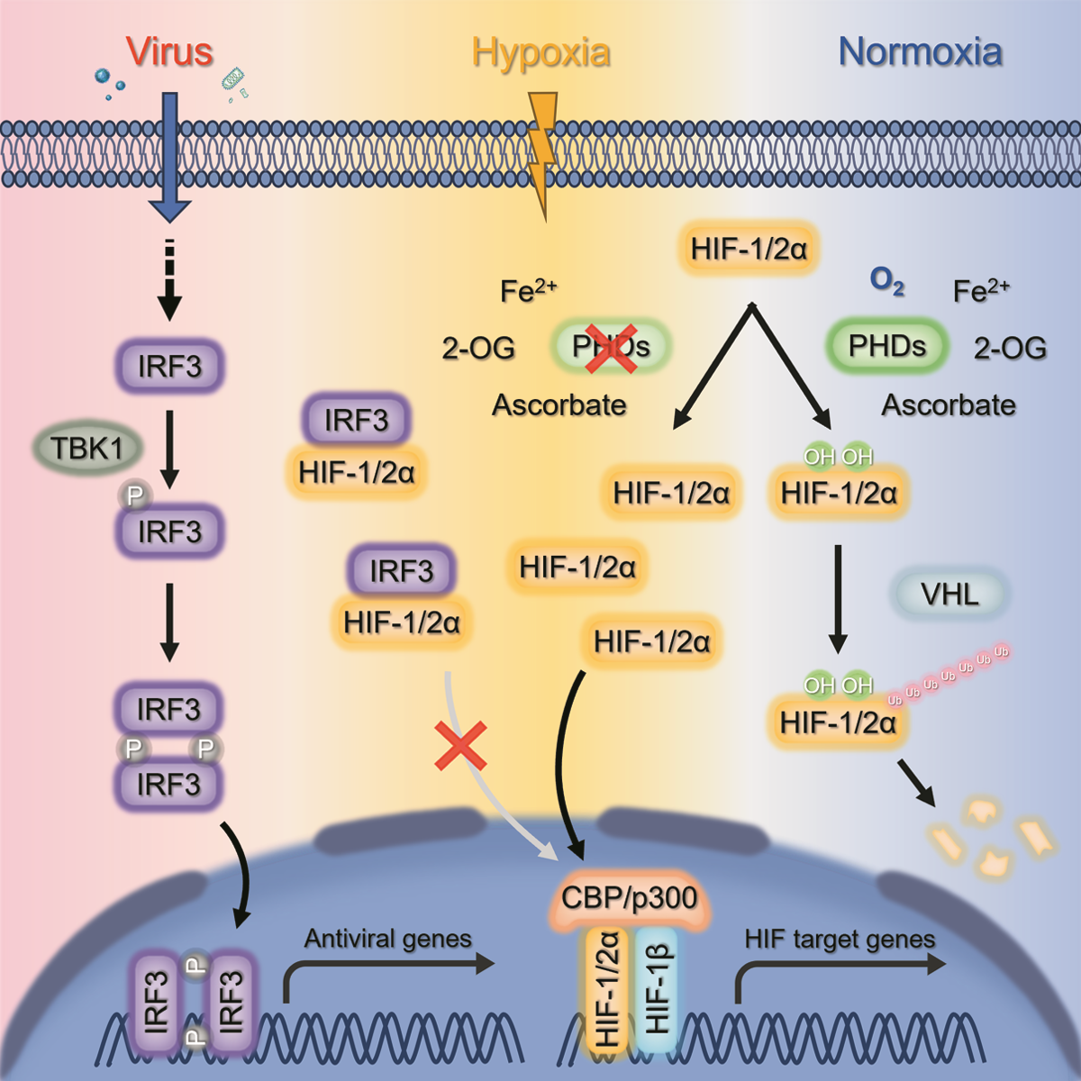 抗病毒天然免疫是机体抵御病毒入侵的第一道防线,其中干扰素调控因子IRF3作为关键转录因子,通过诱导干扰素等抗病毒基因表达发挥核心调控作用。与此同时,低氧信号转导是机体适应低氧胁迫的主要通路,其核心转录因子HIF-1α和HIF-2α通过调控能量代谢、血管生成等生理过程相关基因,参与机体低氧适应与耐受。值得注意的是,这两种蛋白的活性受到多层次调控。