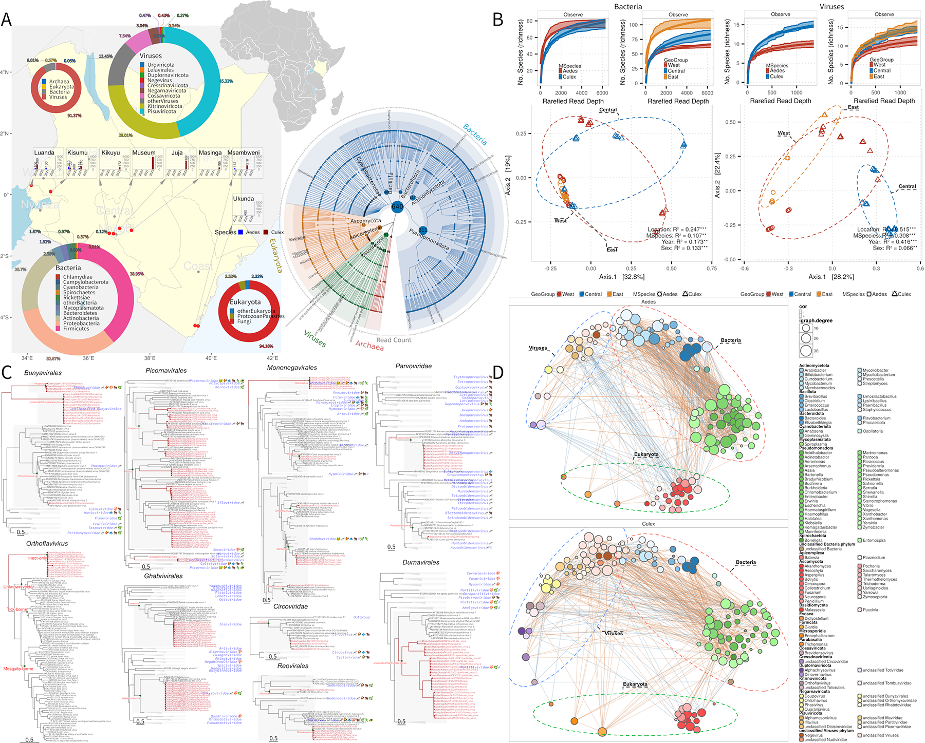 研究对2019-2023年间从肯尼亚8个生态区采集的伊蚊和库蚊(图1A),采用宏转录组学技术并结合多维度统计建模与共现网络(co-occurrence network)分析,发现肯尼亚蚊虫微生物组呈现的特征为病毒在数量上占优势,而细菌则主导种类多样性(图1B)。在宏观尺度上,地理区域是决定其微生物组整体构成的首要因素;而在局部尺度(如城市/采样点),蚊虫的种类则成为影响其微生物组多样性的关键。进一步分析表明,伊蚊与库蚊的微生物共现网络存在差异显著。伊蚊的微生物网络相对库蚊更为稳固,伊蚊网络中以细菌类群为核心枢纽,库蚊网络中病毒扮演更为关键的角色(图1D)。此外,研究团队从这些蚊虫中鉴定出102种病毒序列,分属24个不同的病毒科,其中31种为潜在的新型RNA病毒。系统发育分析还揭示,在布尼亚病毒目、小RNA病毒目等已知大类中,存在尚未被分类的进化分支(图1C)。