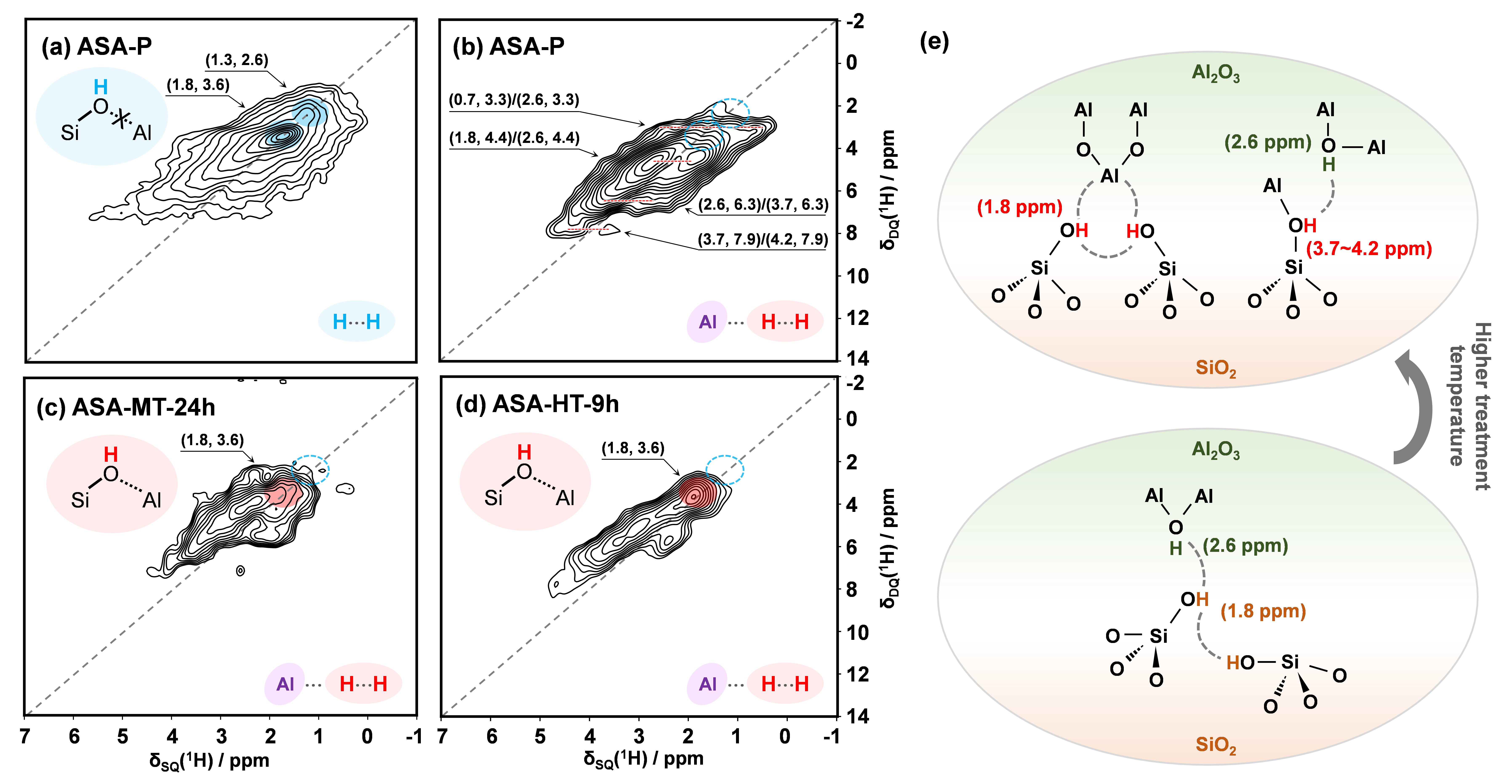 图1. (a) 脱水ASA-P的二维1H-1H DQ/SQ NMR谱图;(b-d) 脱水ASA-P、ASA-MT-24h和ASA-HT-9h的二维1H-1H f-DQ/SQ NMR谱图;(e) 提出的ASA表面物种结构模型